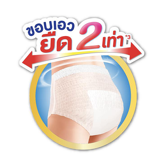 ใส่ง่ายด้วยขอบเอวยืด 2 เท่า*3 มีขอบเอวระบายเหงื่อรอบด้าน ลดความอับชื้น มาพร้อมแอนตี้แบคโพลิเมอร์ ที่ช่วยลดการสะสมของแบคทีเรีย ซึมซับ 9แก้ว*1 หรือ 900cc ให้คุณสัมผัสความสบายใจและสบายตัวตลอดวัน